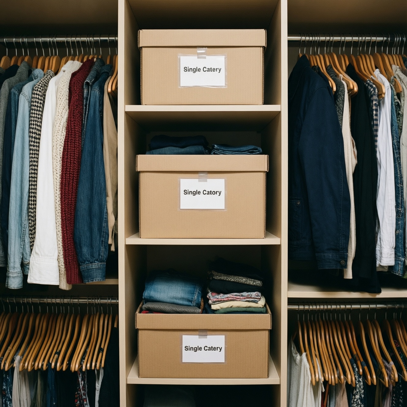 - Бюджетно: одинаковые картонные коробки + плотные наклейки/скотч для подписей (лучше, когда коробки стоят внутри шкафа и не трутся).