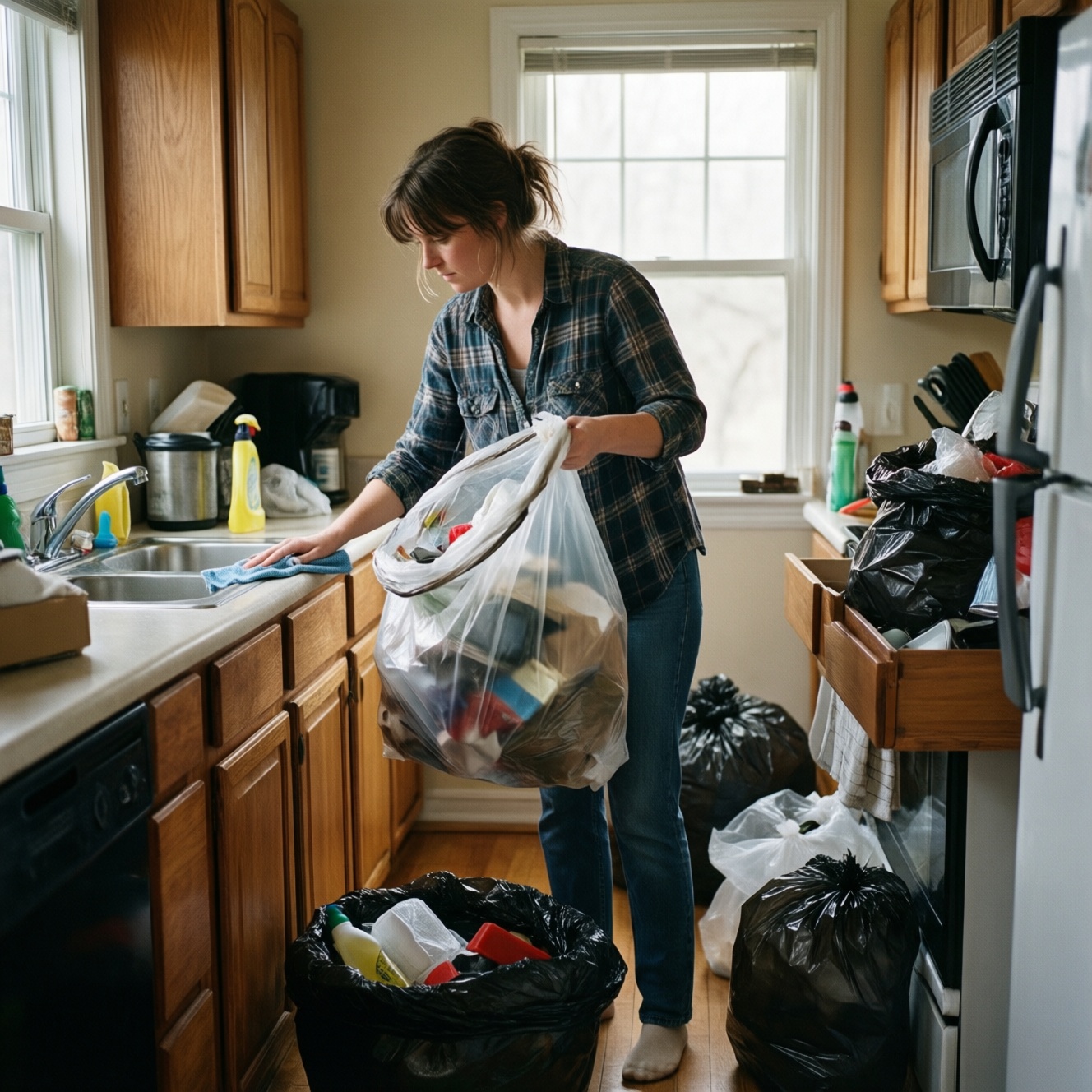 Пройди по видимым зонам и собери упаковки, салфетки, пустые бутылки, старые чеки. Не сортируй идеально: цель - убрать с глаз.